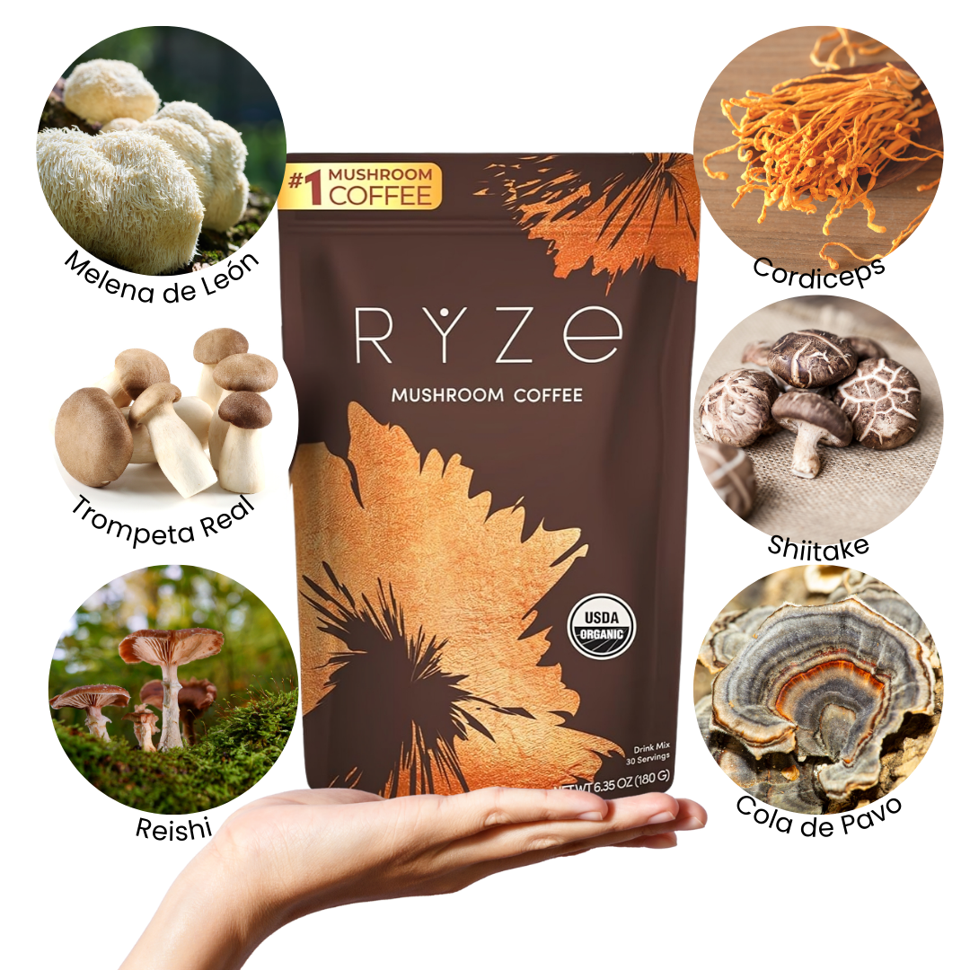 Elige RYZE porque te ofrece energía limpia y un enfoque mental superior sin la ansiedad y el "bajón" del café tradicional. Es café mejorado con el poder orgánico de los superhongos para un bienestar y productividad que dura todo el día.