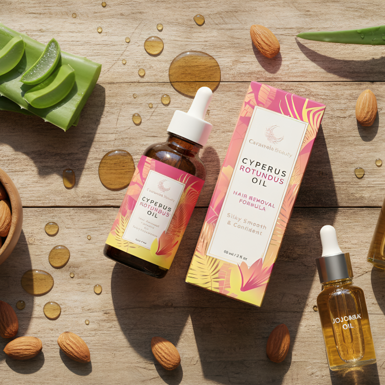 El corazón de este producto es el Aceite de Cyperus Rotundus. Este ingrediente clave es reconocido por sus propiedades que ayudan a inhibir y debilitar el folículo piloso, haciendo que el vello crezca más lento, fino y menos denso. Al ser una fórmula oleosa, garantiza que la piel no solo experimente la reducción del vello, sino que también reciba una hidratación profunda que calma la irritación y proporciona el acabado "Silky Smooth" que Caramela Beauty promete.