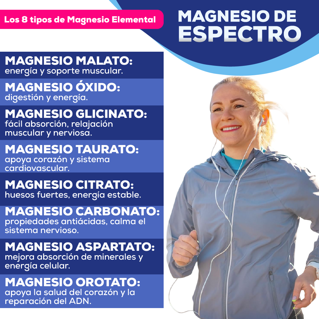 Su fórmula premium incluye óxido de magnesio, citrato, malato, aspartato, bisglicinato, taurato, succinato y orotato, aportando más de 400 mg de magnesio elemental por dosis, ideal para mantener funciones clave del cuerpo en óptimo estado.