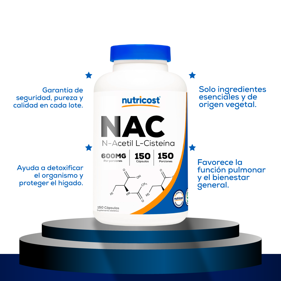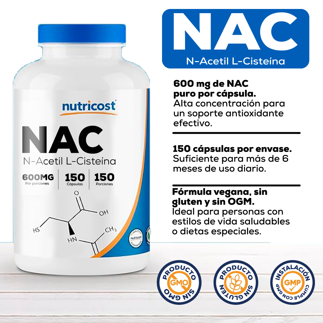 - Potencia tu bienestar desde el interior con una de las moléculas más estudiadas por la ciencia: N-acetil L-cisteína (NAC). Esta fórmula avanzada aporta 600 mg de NAC por cápsula, ayudando a reponer los niveles de glutatión, el antioxidante maestro del cuerpo, esencial para la protección celular, la salud respiratoria y el funcionamiento hepático.