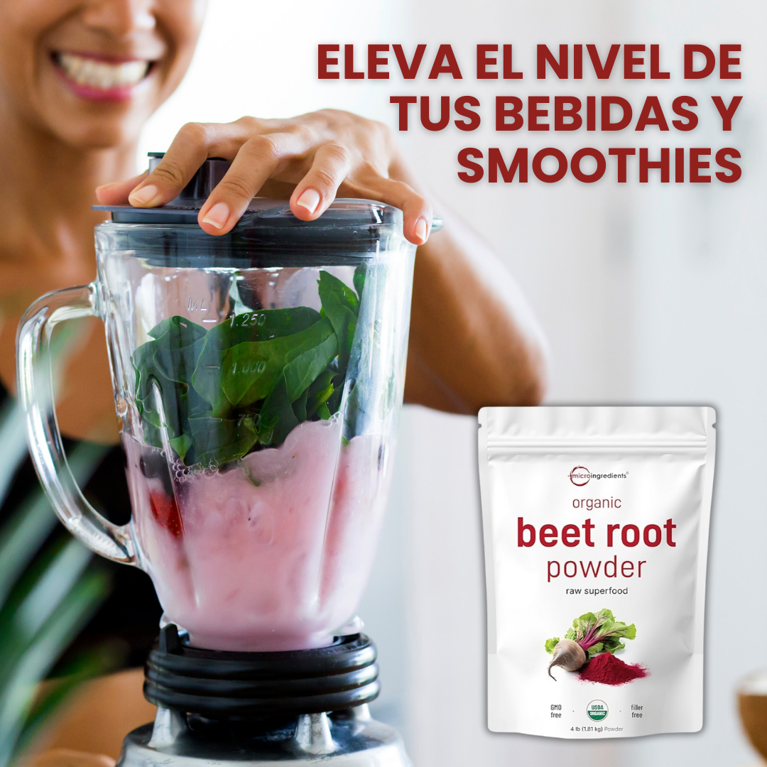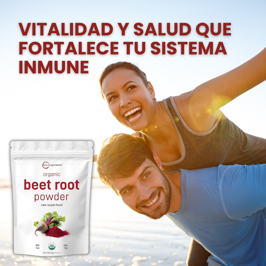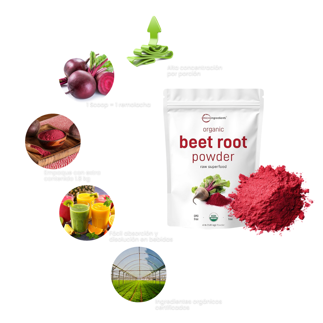 El beneficio principal es la mejora del rendimiento físico y la resistencia. El polvo es extremadamente rico en nitratos naturales, que tu cuerpo convierte en óxido nítrico. Esto ayuda a dilatar los vasos sanguíneos, mejorando el flujo de oxígeno y nutrientes a tus músculos durante el ejercicio.