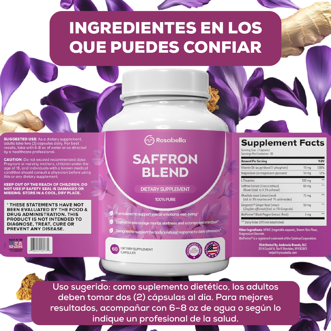 Descubre una forma elegante de armonizar cuerpo y mente con Rosabella Saffron Blend, una fórmula diaria enfocada en apoyar tu estado de ánimo, concentración y equilibrio emocional. Esta mezcla premium incluye extracto de azafrán acompañado de vitamina B6, magnesio, L-teanina y extractos herbales, diseñada para ofrecer claridad mental sin recurrir a estimulantes artific artificiales. Cada cápsula es pura, sin gluten ni aditivos, y viene de una manufactura certificada GMP en EE. UU., garantizando calidad y confianza en cada toma.